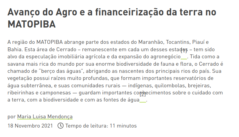 [5] STEFANO, Daniela; LIMA, Débora; MENDONÇA, Maria Luisa. Especulação com terras na região Matopiba e impactos socioambientais, 2020. <https://www.social.org.br/pub/revistas-portugues/252-especulacao-com-terras-na-regiao-matopiba-e-impactos-socioambientais>