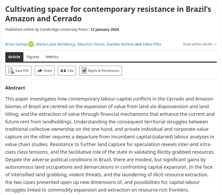 The intensification of invasion and grabbing of lands in Brazil’s Amazon and Cerrado biomes, the expansion of agribusiness linked to corporate financial strategies, and the re-regulation of land titling and resource licensing continue to generate violent social tensions. The collective resistance of communities in territories affected by contemporary land capitalisation reveals the local and transnational actors involved in speculation and theft. These territorial struggles, which depart from incumbent capital-labour analyses, invite further understanding of the inter-and intra-class tensions, the facilitative role of the state in the value grabbing (Andreucci et al Reference Andreucci, García-Lamarca and Wedekind2017), and the significance of autonomous land occupations and demarcations in confronting capital expansion on resource-rich frontiers.