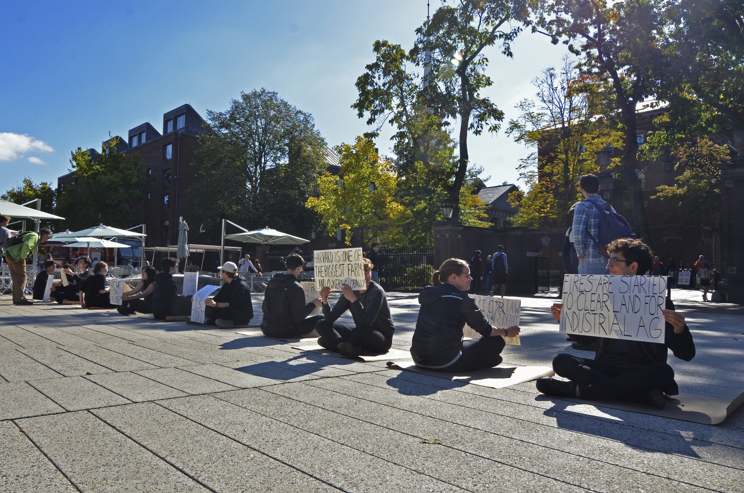 On Monday morning, nearly a dozen members of Divest Harvard sat in the Science Center Plaza and held signs decrying Harvard’s land investments.