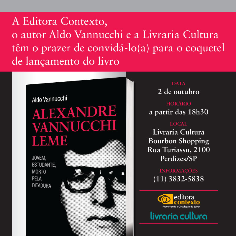 O livro “Alexandre Vannuchi Leme – Jovem, Estudante, Morto pela ditadura” será lançado na Livraria Cultura do Shopping Bourbon, Rua Turiassu 2100 – Perdizes