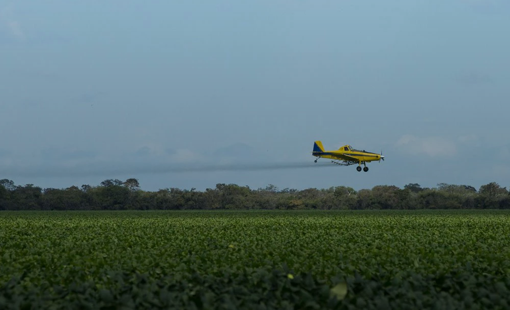 Um avião passa pulverizando as plantações de soja, cena comum nos meses de colheita por ali, entre janeiro e maio. Fora do carro, o cheiro beira o insuportável.