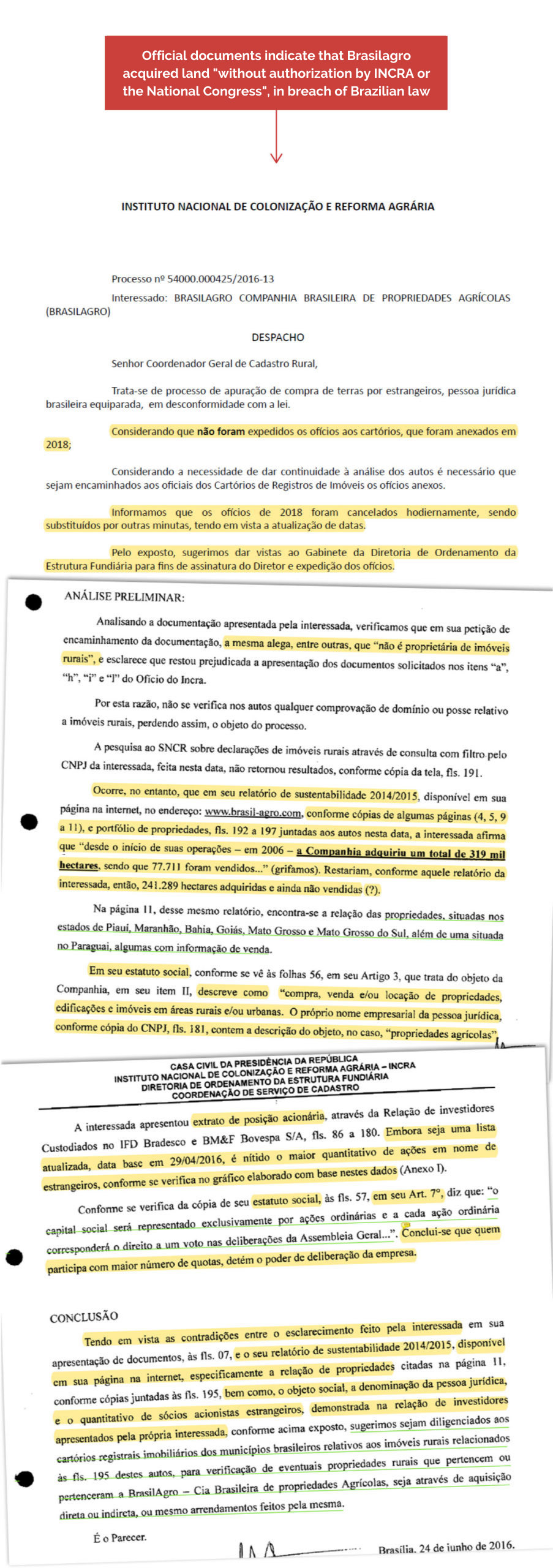 The government maintains the understanding that “rural properties were purchased by BrasilAgro without the authorization of INCRA or the National Congress, following the publication of Parecer AGU/LA-01/2010,” the legislation that regulates the issue.