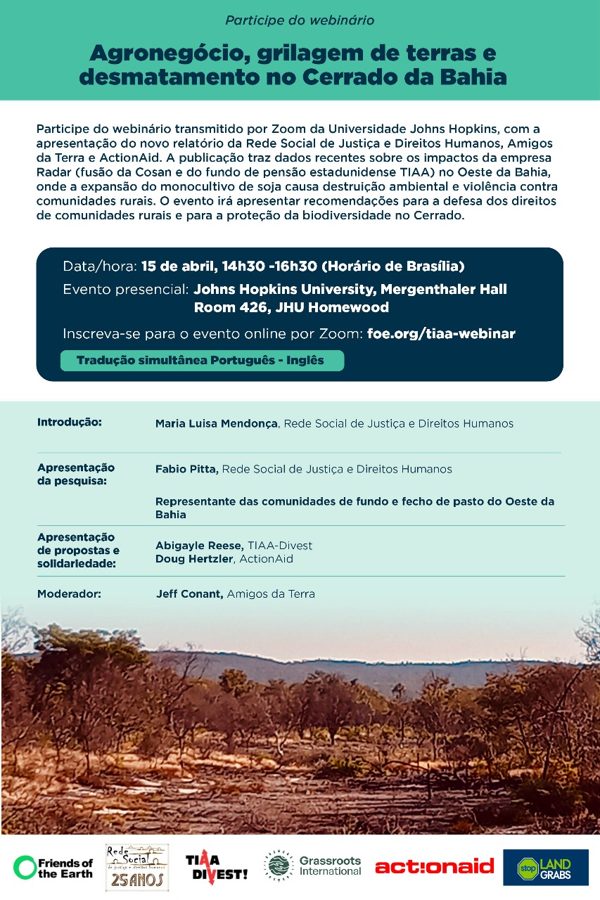 Participe do webinário transmitido por Zoom da Johns Hopkins University com pesquisadores da Rede Social de Justiça e Direitos Humanos, Friends of the Earth e ActionAid, que apresentam um novo relatório sobre a empresa Radar (fusão da Cosan e do fundo de pensão estadunidense TIAA) no Oeste da Bahia, onde a expansão do monocultivo de soja causa destruição ambiental e violência contra comunidades rurais.